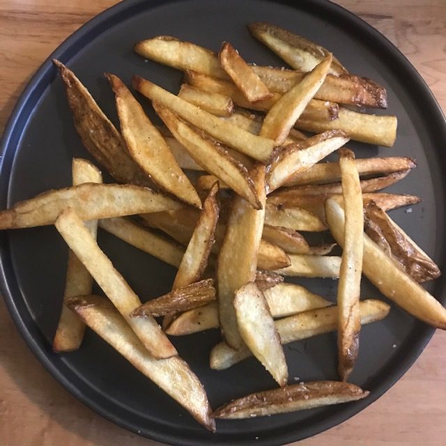 - Cut up the potatoes into fries and add them to a bowl of water to soak for about an hour.