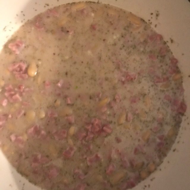 - Follow up by the Seasonings, chicken broth, and ham. Mix everything well.