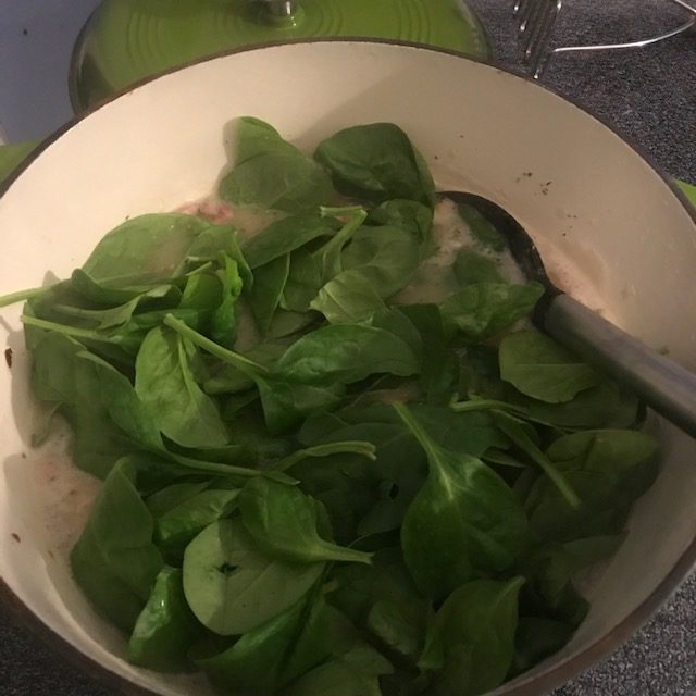 - Once boiling takes the lid off and reduce the heat to a medium-low. Add in the Baby Spinach. Let it simmer for 15 minutes. Stir as needed.