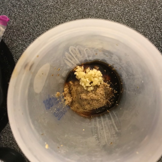 - Add the Brown Sugar, Whiskey, Soy Sauce, mustard, salt, Worcestershire sauce, some pepper, & your minced Garlic to your shaker bottle.