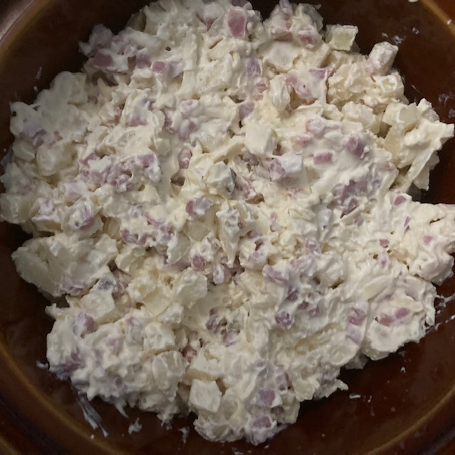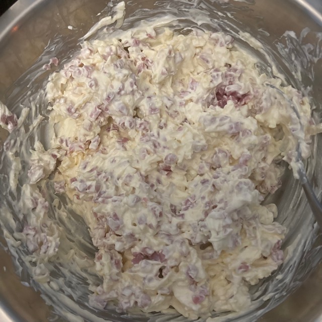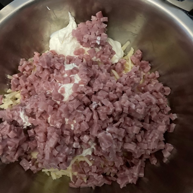 - In a large bowl put in your Cream of Chicken, Sour Cream, Cheese, and Diced Ham.