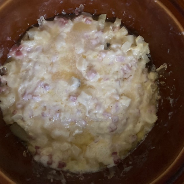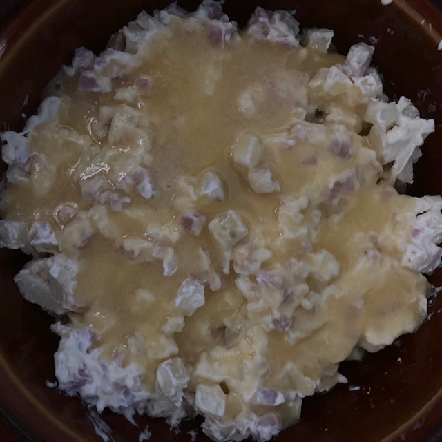 - Mix the flour into the butter and then pour this on top of the Ham and Hash in the slow cooker.