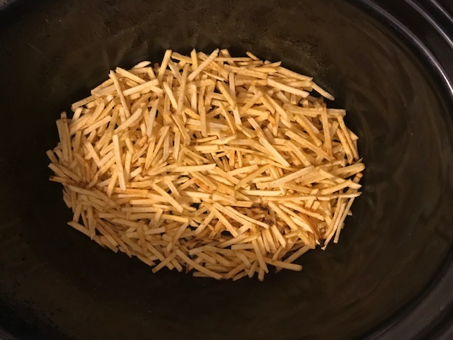 - Cover the bottom with a layer of potato sticks around half of the 8oz.