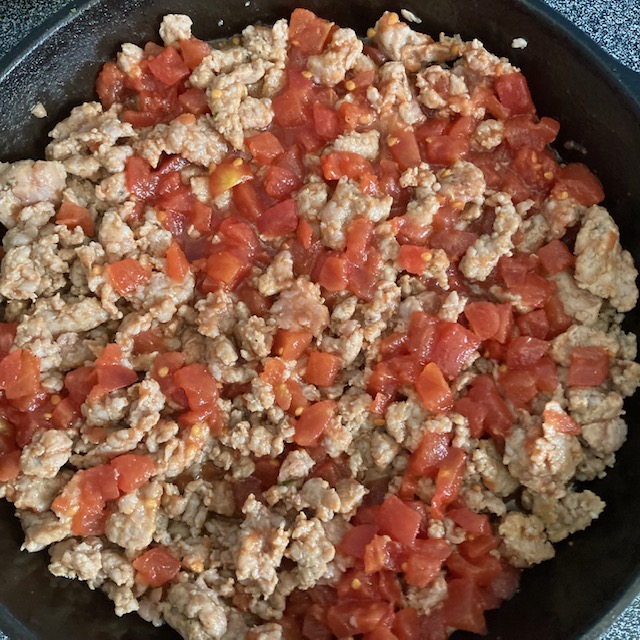 - Break up and cook the Italian sausage until browned and then add the can of diced tomatoes.