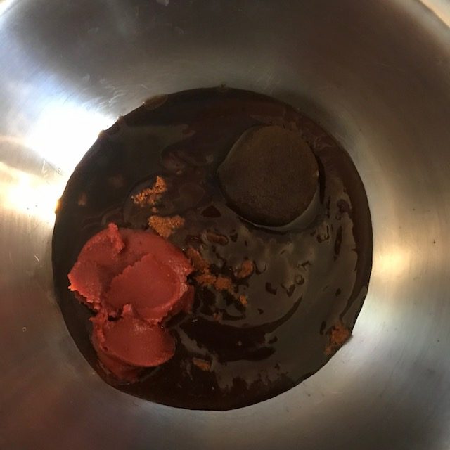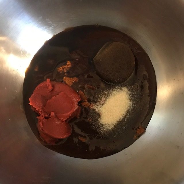 - In a large bowl add in 1 cup of the BBQ sauce, Brown Sugar, Worcestershire sauce, crushed up beef cube, tomato paste, & onion powder.