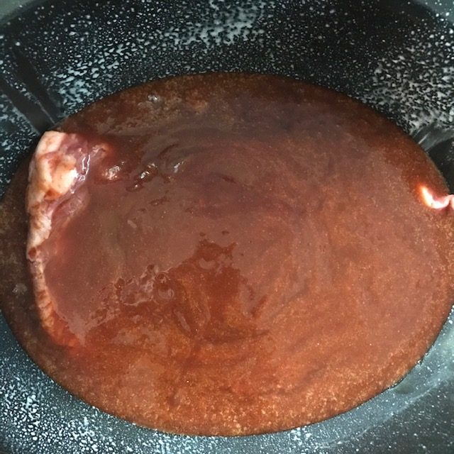 - Spray the slow cooker with a little cooking spray and add in the Brisket.