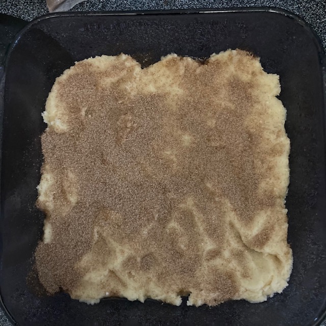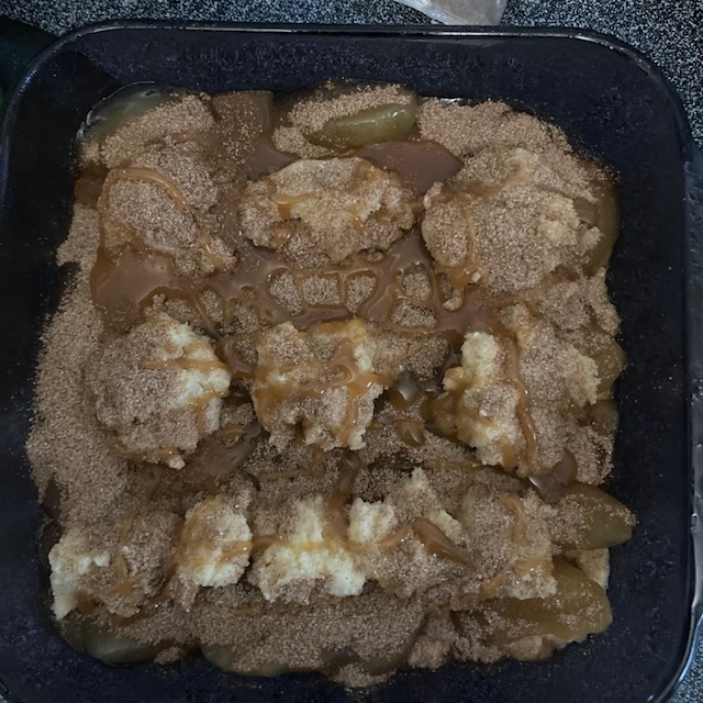 - Sprinkle the rest of the cinnamon sugar over the cookie mix and then the rest of the caramel topping.