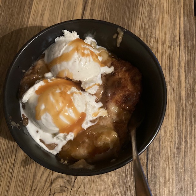 - Remove from the oven, let it cool for a few minutes, and then bowl with vanilla ice cream. Maybe add a little more caramel on top of your bowl.