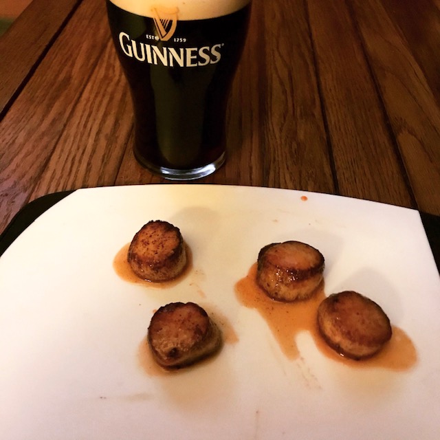 I believe all seafood especial clams, mussels, oysters, & scallops go best with the one and only Guinness. The reason being Guinness has four of the five taste senses. Guinness has Sweet, sour, savory, and bitterness. The seafood especially oysters have the 5th sense which is salt, so with all 5 combined we have the best ever combination! Sweet Simple Sea Scallops go well with Guinness!
