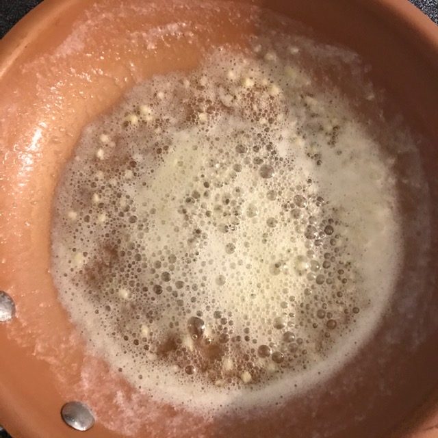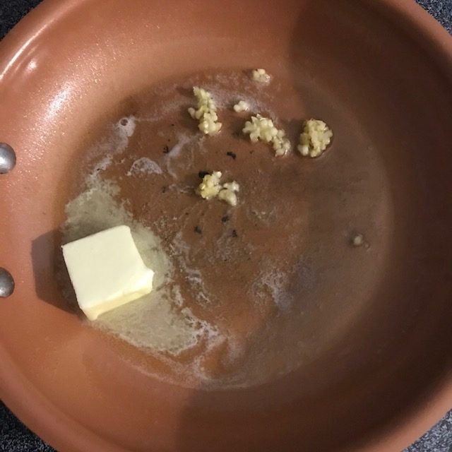 - Melt your butter in the pan and as it melts add in the garlic and a small amount of olive oil. The oil will help to stop the butter from burning.