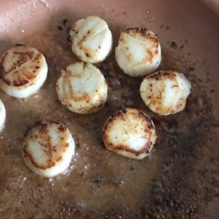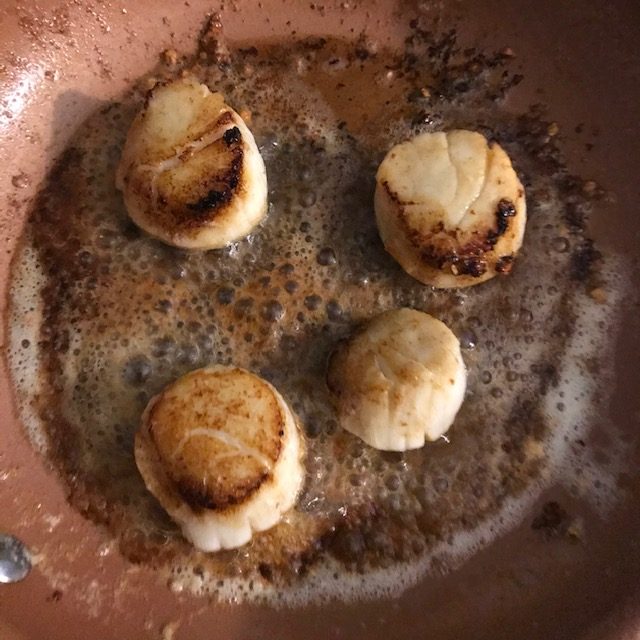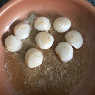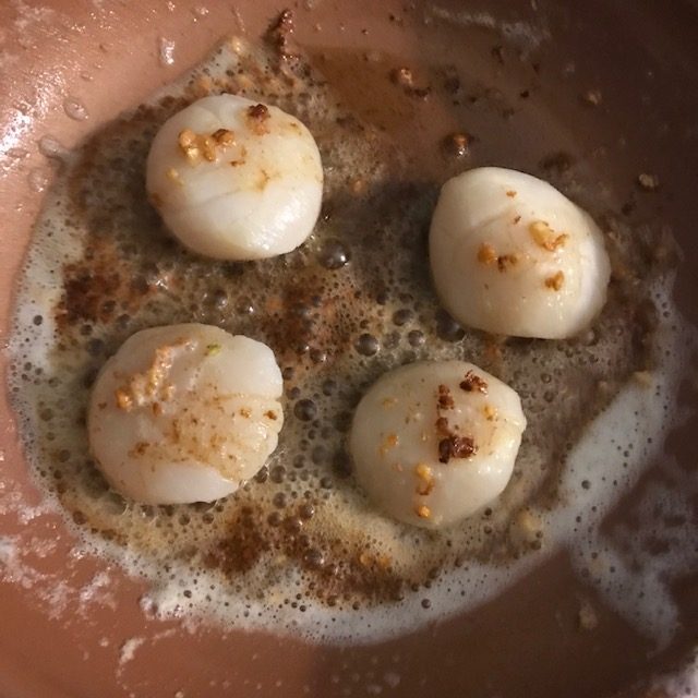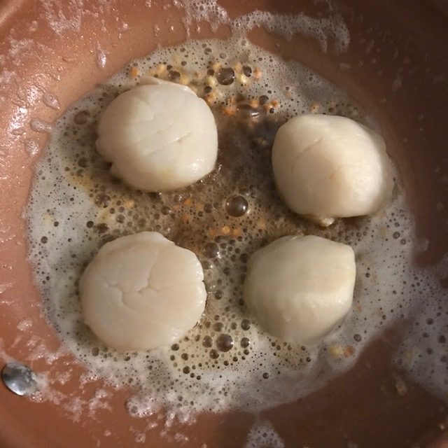 - Place the scallops in the pan and let them start to cook. If they don’t sizzle right away then the pan is not hot enough. Use a spoon to cover the scallops in butter and garlic as they cook.