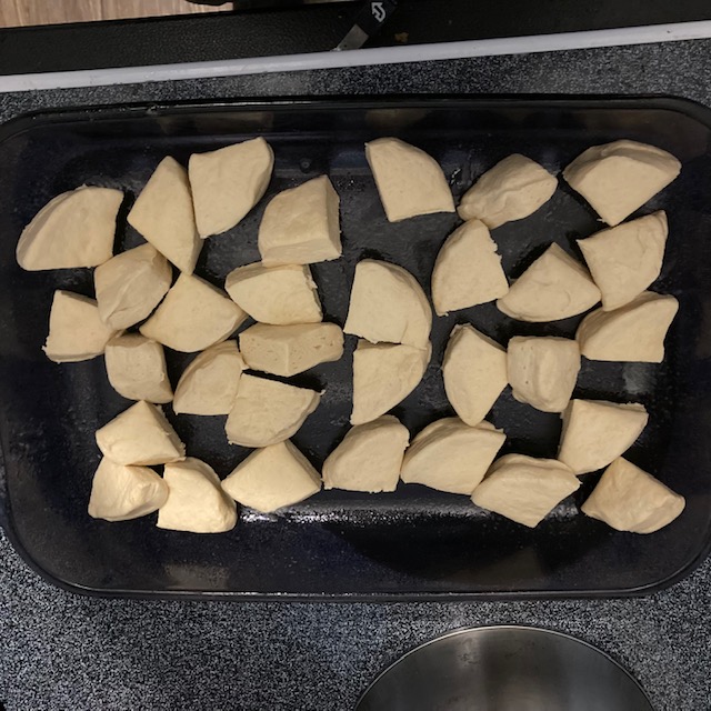 - Cut the biscuits into quarters and add them to the Pan.