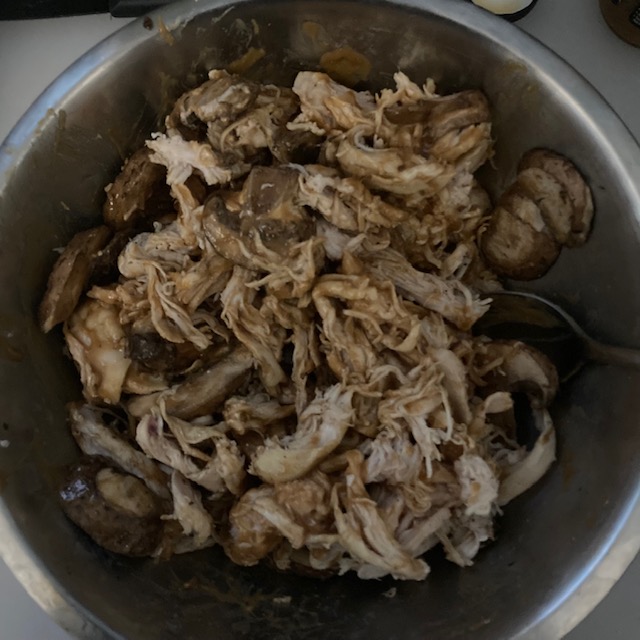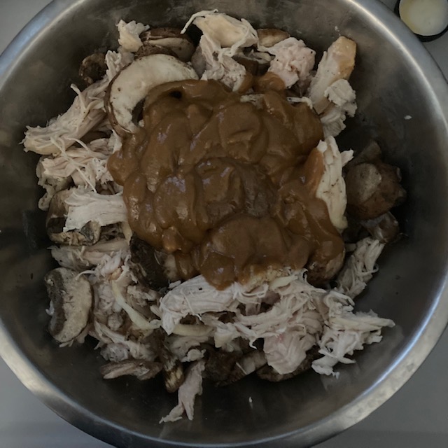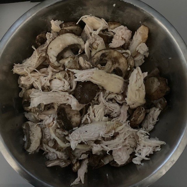- In a large bowl combine the Chicken, Mushrooms, & ¾ of the Sauce. Save a little for topping your meal.
