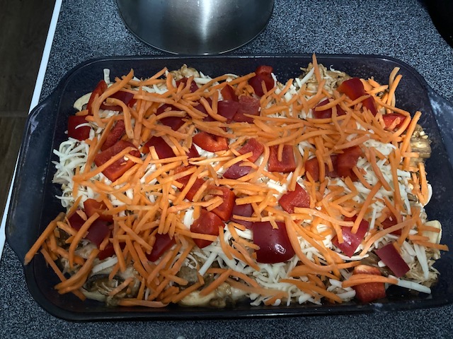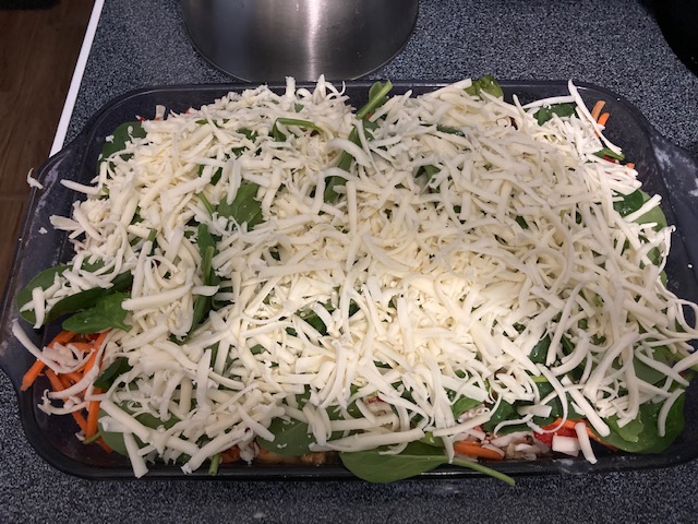- Layer the Red Peppers, Carrots, & spinach on top of the cheese.