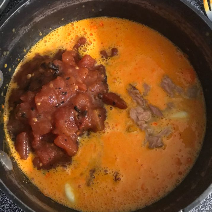 - Now add the drained tuna and the fire-roasted tomatoes.
