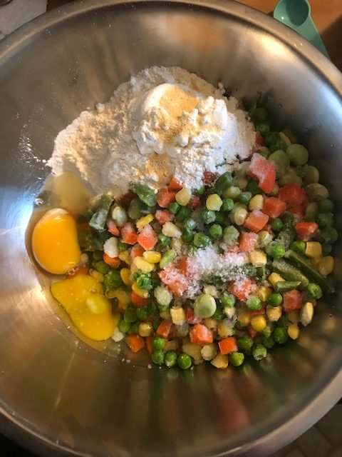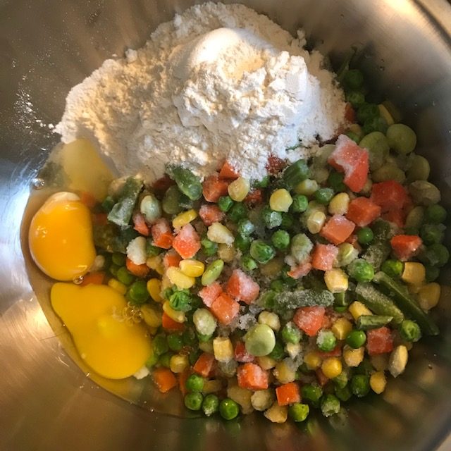 - In a large mixing bowl add in the Veggies, Garlic Powder, Salt, Flour, and 2 large eggs.