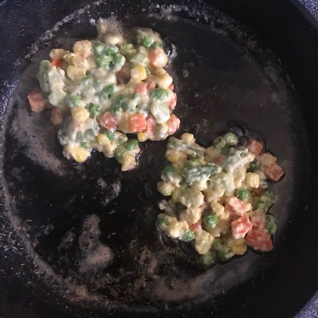 - Once the Pan is up to heat add in 1/3 Cup of the mix per Fritter. You can do a couple at a time depending on the size of the Pan.