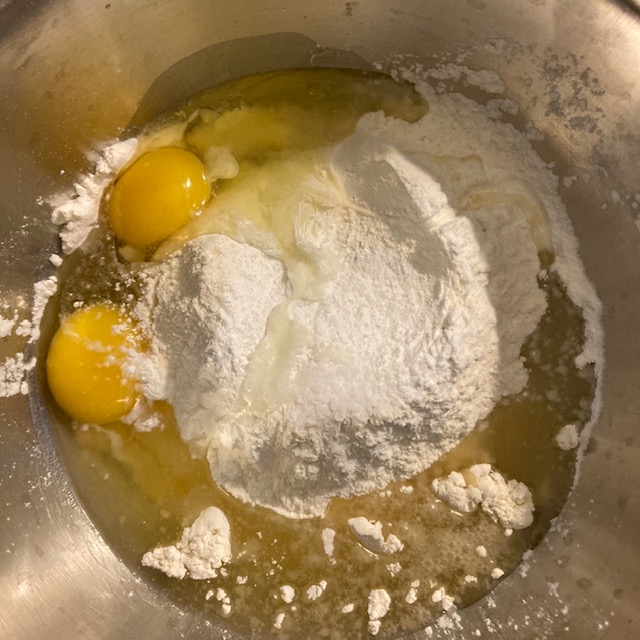 - In a small bowl beat 2 large eggs and add in the milk and Vegetable oil.